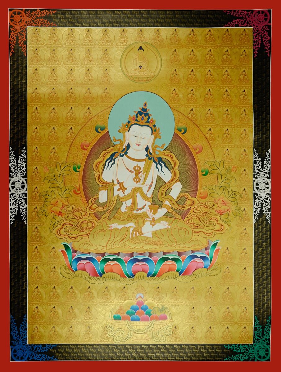 This thangka is 108 unique representations of Vajrasattva, a Bodhisattva of Purification; it holds great significance in Tibetan Buddhism, particularly within Vajrayana practice, serving as tools for spiritual purification, devotion, and meditation. 108 has significant meaning in various Buddhist traditions, symbolizing the cleansing of 108 defilements or negative karmic actions that must be addressed for spiritual freedom. The 108 Vajrasattva Thankga serve as a source of inspiration for practitioners, guiding them to concentrate on purification and converting negative actions into positive karma.