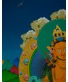 Jambhala is a wealth deity whose blessings remove the obstacle of poverty, bringing wealth and abundance to pure Dharma practitioners. As it is difficult to attain spiritual realizations while afflicted by lack of resources, Jambhala generates prosperity so that practitioners have the time, energy, and means to accomplish. According to the Sutras, while Shakyamuni Buddha was teaching one day, demons tried to disturb and confuse the Buddha. Jambhala appeared in front of the Buddha and protected him. Recognizing Jambhala's courageous action, the Buddha asked Jambhala if he would like to become a Dharma Protector in order to help all sentient beings. Jambhala accepted the Buddha's offer, and since then he has offered immediate assistance to all who call his name or chant his mantra. His blessings bestow good luck, increase virtues, prolong life, increase intelligence, and provide both material and spiritual benefits.