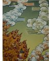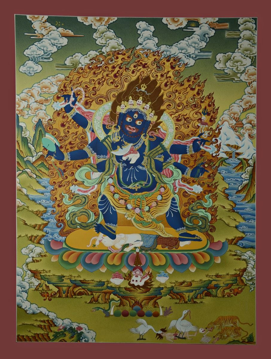 Mahakala is depicted in a number of variations, each with different qualities and accoutrements. In most depictions, such as this one of his Black aspect, he wears a crown of five skulls. These skulls represent his transmutation of the five poisons (greed, hatred, ignorance, pride, and jealousy) into the five transcendent wisdoms. He is seen standing on the corpse of the elephant-headed god Ganesh, demostrating that he is the supreme destroyer of obstacles. His color Black further signifies his function of destroying evil and obstructions to the spiritual path. He is considered to be a fierce and wrathful aspect of Avalokiteshvara, Lord of Compassion.