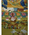He has six arms, symbolizing his attainment of the six perfections of a Bodhisattva. His two feet represent wisdom and method. In his upper right hand he holds a rosary of human skulls, which he continuously counts, demonstrating his unceasing activity for the benefit of sentient beings. In his lower right hand he holds a ritual drum, or damaru , which he uses to invoke all Buddhas to bless sentient beings, and whose sound is likened to the beautiful sound of the Dharma teachings. His upper left hand holds a trident, symbolizing his abandonment of the imprints of delusions of the three realms. His lower left hand holds a lasso, indicating his power to bind demons and evil forces. His two main hands hold a ritual curved knife, representing his ability to sever the root of delusion, and a skull bowl brimming with the blood of the four maras, symbolizing his realization of emptiness and his victory over the forces of death.