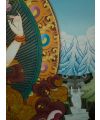 In the Tibetan Buddhist pantheon of enlightened beings, Chenrezig is renowned as the embodiment of the compassion of all the Buddhas. Chenrezig is visualized in many forms, with various numbers of faces and arms, and various colors and ornaments. This four-armed form is a radiant white Budhda form representing the purity and power of the enlightened mind's loving kindness and compassion. He sits on a lotus and the flat disc of the moon, with another moon disc behind him, reflecting his total purity. Two of his four arms are joined in the prayer position holding the wish-fulfilling gem. In his other left hand he holds a lotus flower and in his right hand, a crystal mala, which he is using to count repetitions of the mantra Om Mani Padme Hum, Hail to the Jewel in the Lotus, which liberates all beings from suffering. He wears the silks and ornaments of a bodhisattva, representing all his special qualities, and the soft skin of an antelope over his shoulder, symbolizing his complete freedom from violence. He smiles with deep understanding, love and compassion as his eyes look upon all beings. His four arms and hands signify the four immeasurables: immeasurable loving kindness, immeasurable compassion, immeasurable joy, and immeasurable equanimity. Chenrezig, the Bodhisattva of Boundless Compassion, is the very embodiment and realization of the four immeasurables.