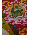 The right hands clasp a mirror, the realisation of ultimate truth, penetrative wisdom and insight; a crystal mala to remind us of the importance of persevering with our Dharma practice, and putting what we learn into action; and a lotus to denote the ultimate state of purity, the curtailing of anger and development of pure compassionate motive that we will achieve with his practice.