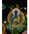 Her right hand is open towards us in the gesture of supreme generosity, signifying her ability to fulfill our spiritual and material needs. Her left hand is in the gesture (mudra) of bestowing blessing, refuge, and protection. She has seven eyes - one in each hand and foot, and a third eye in her face - to show that she sees and responds to suffering throughout the universe; and she sits in the full lotus, or vajra, posture. Her left hand holds the stem of a blossoming white lotus signifying her spiritual perfection and complete purity of body, speech and mind.