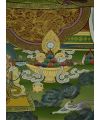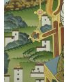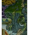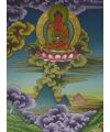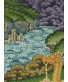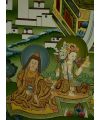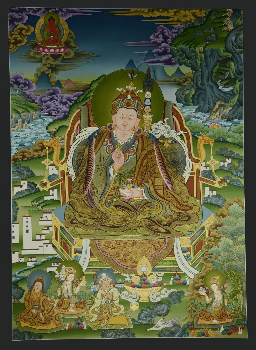 Guru Rinpoche, regarded as an emanation of Buddha Amitabha, was born miraculously from a lotus blossom in the land of Oddiyana located in present-day Pakistan. He was known far and wide for his miracle powers, including his ability to subdue spirits. At the request of the king, Guru Padmasambhavajourneyed to Tibet and engaged the local nature spirits in magical combat. Conquering these spirits, he bound them by oath to protect the Dharma for all time. Evidence of his victories in these battles can still be seen throughout the valleys and villages of Tibet, where he is affectionately known as "Guru Rinpoche," meaning "Precious Master."