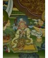 Here, Guru Padmasambhava can be seen in his most well-known representation. His eyes are open in a piercing gaze; his face is wrathful and smiling, blazing magnificently with mysterious power. He cradles a khatvanga in his left arm, representing his consort Mandarava, who arouses realization of emptiness. His khatvanga is crowned with three severed heads and a trident, symbolizing Guru Rinpoche's liberation from the three kayas of desire, form, and formlessness.