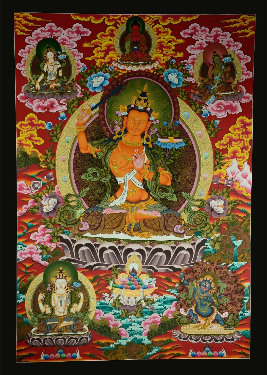 Manjushri embodies the omniscient wisdom of enlightenment - the wisdom that discerns the true nature of reality. He can discriminate between correct and incorrect views and between beneficial and non-beneficial actions to be taken on one's spiritual path. He bestows intelligence, knowledge, wisdom, mastery of the teachings, eloquence and memory. His name means "gentle glory" and he is especially revered in Nepal, where he is said to have enabled the founding of civilization in the Kathmandu Valley. Manjushri is also the patron Bodhisattva of the Kadampa (i.e. Gelugpa) order of Tibetan Buddhism, which is famous for its master scholars, called geshes.