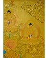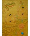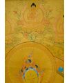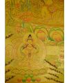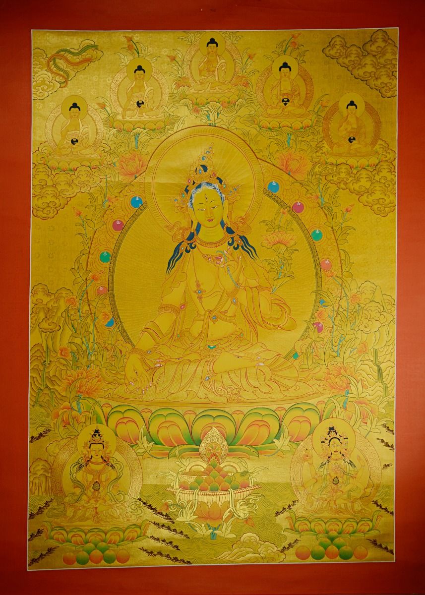 Her right hand is open towards us in the gesture of supreme generosity, signifying her ability to fulfill our spiritual and material needs. Her left hand is in the gesture (mudra) of bestowing blessing, refuge, and protection. She has seven eyes - one in each hand and foot, and a third eye in her face - to show that she sees and responds to suffering throughout the universe; and she sits in the full lotus, or vajra, posture. Her left hand holds the stem of a blossoming white lotus signifying her spiritual perfection and complete purity of body, speech and mind.