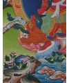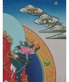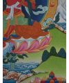 In the Thangka, Red Tara is typically depicted seated on a lotus throne, her body radiating a brilliant red hue, symbolizing fierce compassion and the transformative power of love. Her right hand is often extended in the gesture of giving, while her left-hand holds a lotus flower, representing purity and the unfolding of spiritual knowledge.