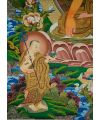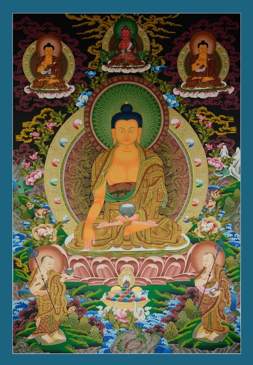 The Shakyamuni Buddha Thangka typically depicts the historical Buddha, Siddhartha Gautama, who achieved enlightenment and became known as "Shakyamuni," meaning "the Sage of the Shakyas." Artwork featuring Shakyamuni often showcases him in various traditional poses, such as sitting in meditation or teaching. In this Thangka, you'll see symbolic elements like lotus flowers, which represent purity and enlightenment, as well as the aura around him, signifying his spiritual power.