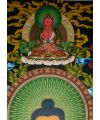 Depicts the Buddha on a lotus throne, surrounded by symbols like lotus flowers and the dharma wheel, representing purity and Buddhist teachings.