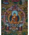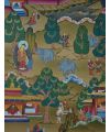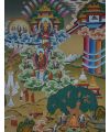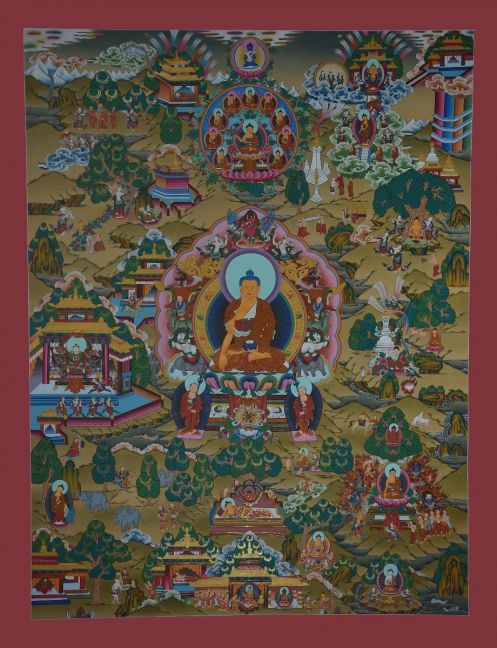 The Buddha life story Thangka is a stunning example of the traditional Tibetan style. It features the enlightened Sakyamuni Buddha seated on a lion throne in an earth-touching posture.