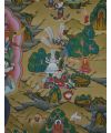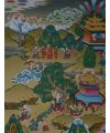 This Thangka captures the life story of Buddha, the moment of enlightenment, with dynamic maras in the background, rendered in vibrant colours. Surrounding the central figure are geometric sections depicting key moments from Sakyamuni's life, framed by linear borders that enhance focus on the main subject. The Thangka is painted on cotton canvas with gold accents on the robes and jewelry that shimmer in the light. The dark backdrop harmonizes the vivid colours, drawing attention to the intricate details of the prince's journey toward enlightenment. This Thangka is brilliant and massive, showcasing remarkable sophistication and depth.